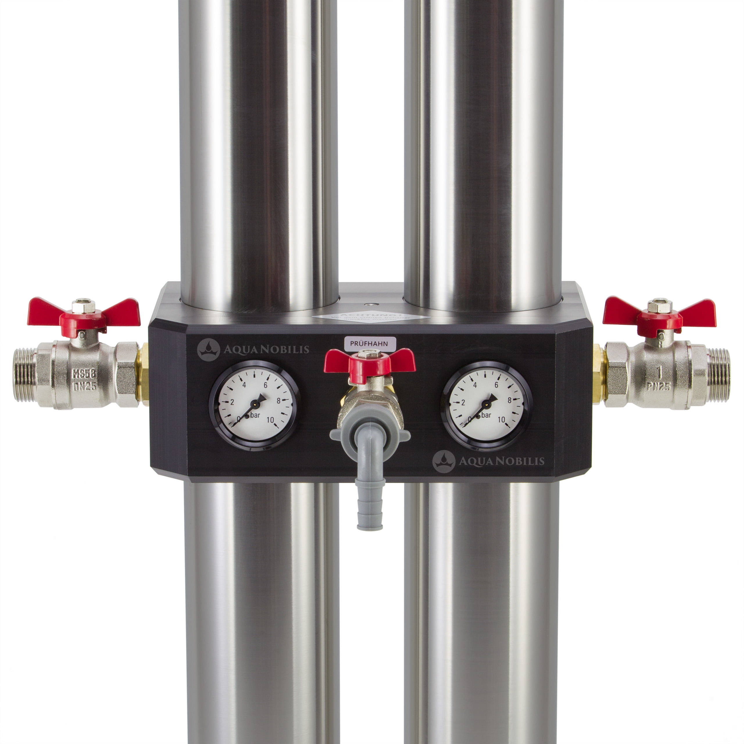 - einem Geräteblock mit zwei Manometern für Ein- und Ausgangswasserdruck und einem Prüfhahn